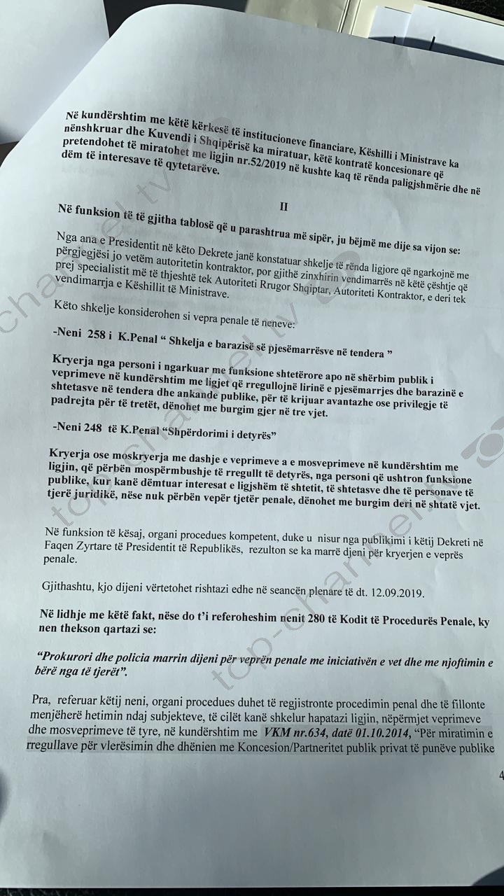 Më tej vazhdoi: “Në këtë kallëzim denoncohen me fakte duke u bazuar edhe me dekretet e kthyera te presidentit dhe raportin e KLSH-së. Denoncohet i gjithë zinxhiri-vendimmarrës, që nga specialisti më i thjeshtë deri te zyrtari më i lartë, që me këtë skeme korruptive i kanë ngarkuar në kurriz shqiptarëve një borxh publik qindra miliona euro” tha Halit Valteri pasi depozitoi kallzimin në prokurori.Topch