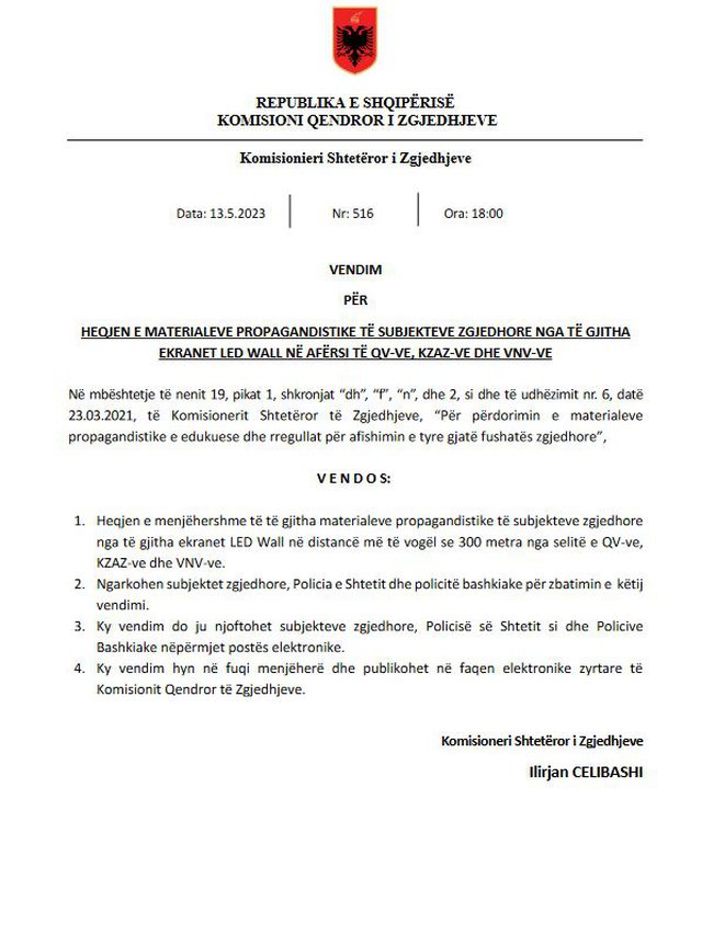 Kreu i KQZ-së, Ilirjan Celibashi ka urdhëruar pasditen e sotme disa orë para zgjedhjeve të 14 majit që të merren masat për heqjen e materialeve propagandistike të subjekteve zgjedhore nga të gjitha ekranet led wall në afërsi të qendrave të votimit.