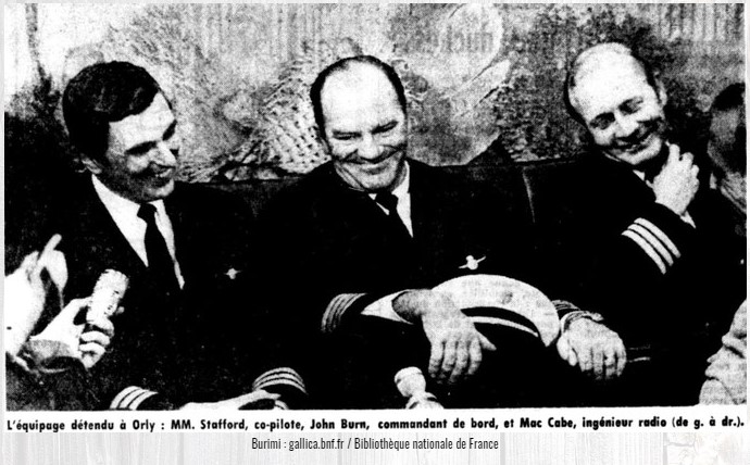Ekuipazhi i relaksuar në Orly (Paris) : Zotërinjtë. Stafford, bashkë-pilot, John Burn, kapiten, dhe Mac Cabe, inxhinier radio (nga e majta në të djathtë). – (Fotografi e “France-Soir”.)
