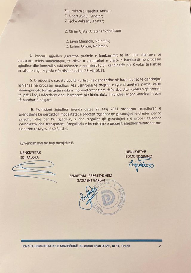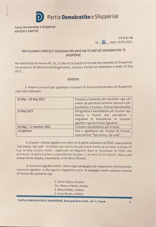 Më poshtë është vendimi i kryesisë, i ratifikuar nga Këshilli Kombëtar për fillimin e procesit zgjedhor të kryetarit të Partisë Demokratike.