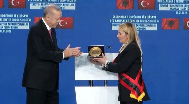 Kryebashkiakja Majlinda Cara, ndërsa ka shprehur mirënjohjen për mbështetjen që Turqia i ka dhënë vendit pas tronditjes nga tërmeti i 2019, i dorëzoi presidentit të Turqisë titullin ‘Qytetar Nderi i Kurbinit’.