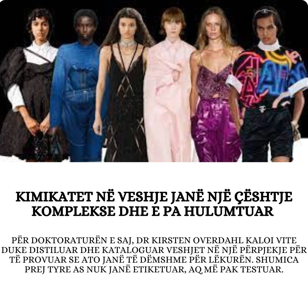 Kimikatet në veshje janë një çështje komplekse, e errët dhe e pa hulumtuar. Për doktoraturën e saj në departamentin e toksikologjisë së integruar dhe shëndetit mjedisor, Dr Kirsten Overdahl kaloi vite duke distiluar dhe kataloguar veshjet në një përpjekje për të provuar se ato janë të dëmshme për lëkurën. Shumica prej tyre as nuk janë etiketuar, aq më pak testuar.