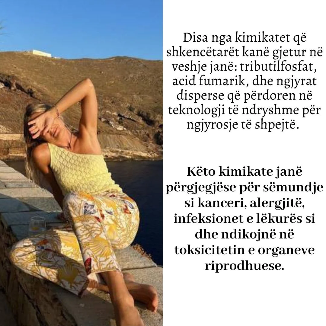 Disa nga kimikatet që shkencëtarët kanë gjetur në veshje janë: tributilfosfat, acid fumarik, dhe ngjyrat disperse që përdoren në teknologji të ndryshme për ngjyrosje të shpejtë. Këto kimikate janë përgjegjëse për sëmundje si kanceri, alergjitë, infeksionet e lëkurës si dhe ndikojnë në toksicitetin e organeve riprodhuese.