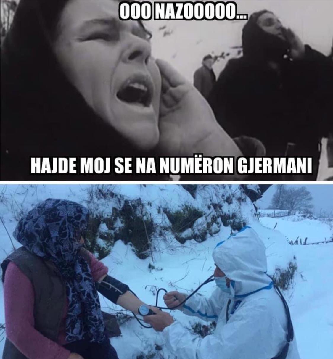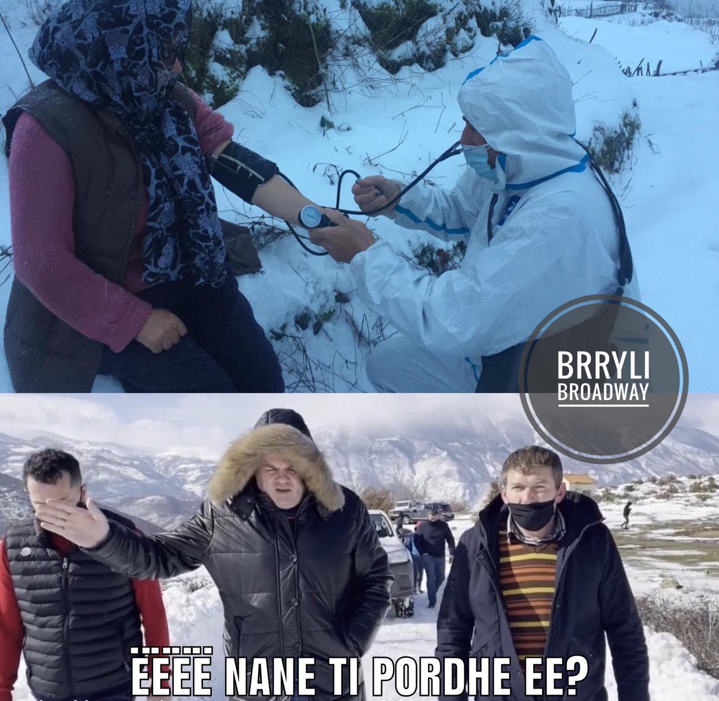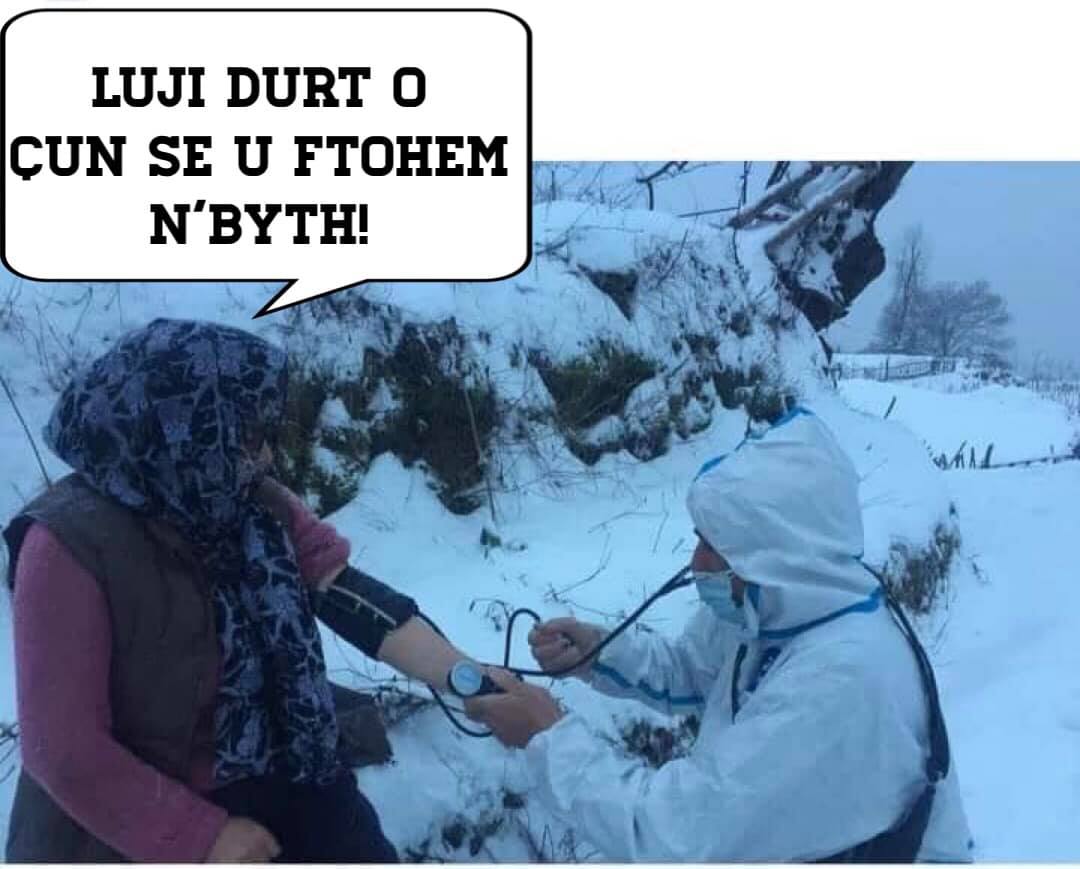 Në njëp kohë kur qytetarët ankoheshin se ishin bllokuar në rrugë nga ngricat apo në zona të ndryshme si pasojë e dëborës, ministrja e Shëndetësisë Ogerta Manastirliu publikoi një foto, sipas së cilës një mjek po i maste tensionin në dëborë një zonje. Kaq ka mjaftuar që në rrjetet sociale të shpërthejnë memet ironizuese. Dhe në raste të tilla fantazia e qytetarëve nuk njeh limite…