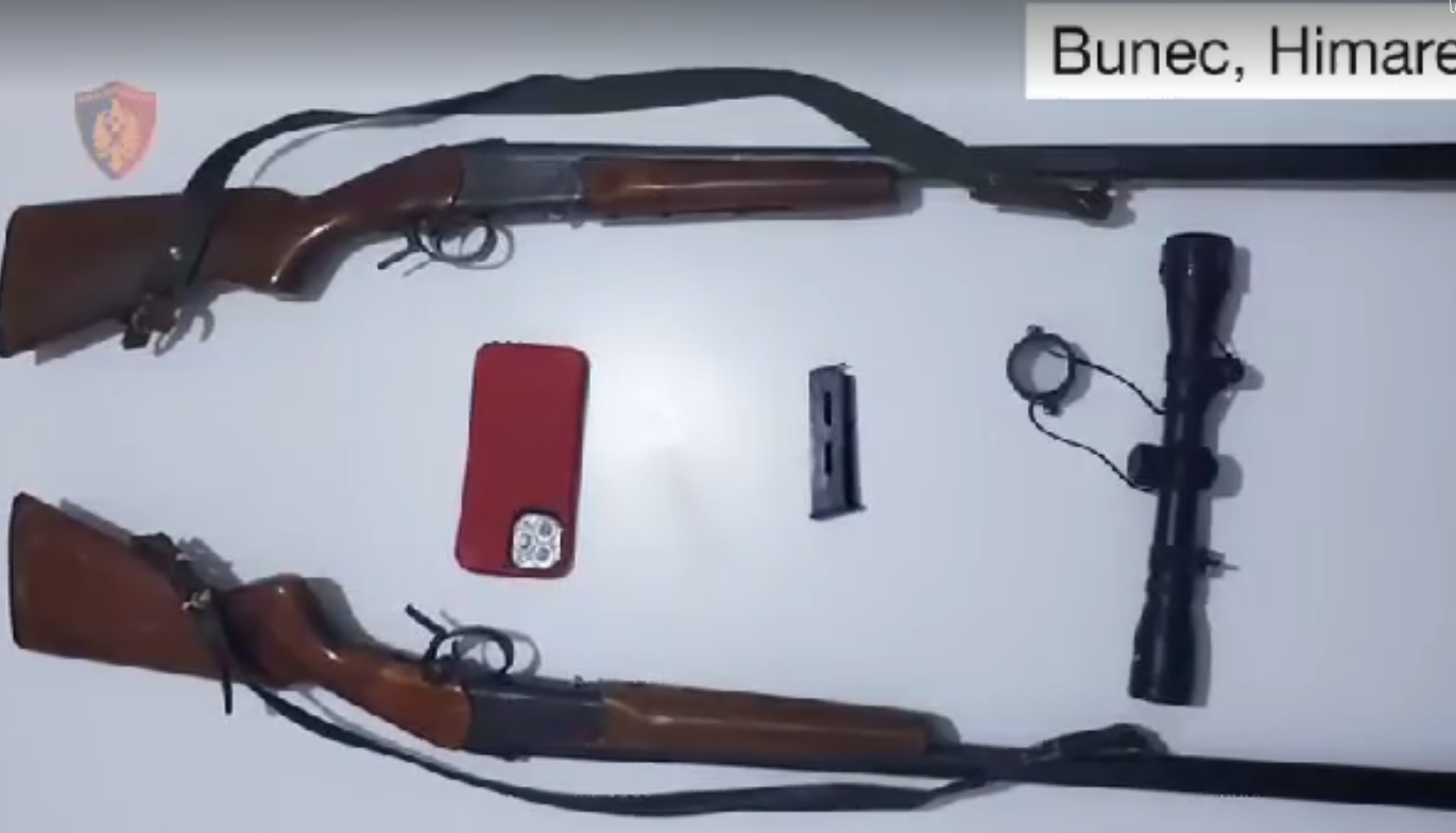 Në pranga ka rënë 42-vjeçari me iniciale E.V si dhe 44-vjeçari me iniciale N.L. Ndërkohë që në kërkim ndodhet 46-vjeçari me iniciale A.V. Po ashtu janë sekuestruar 2 armë gjahu, 1 krehër arme zjarri pistoletë, 1 shenjestër optike për snajper, 1 automjet dhe 1 aparat celular.
