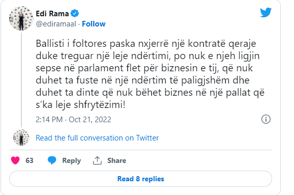 Sa për lejen e ndërtimit ajo është shkelur, pra është bërë nul nga vetë ndërtuesi,që duke tejkaluar edhe 10%-shin e tolerancës ligjore e ka bërë ndërtimin objekt të sekuestrimit sipas ligjit! Po s’ke ç’i bën, nga fshehjet në kotece tek futjet në pallate pa leje, zakon ballistash”, shkruan Rama.