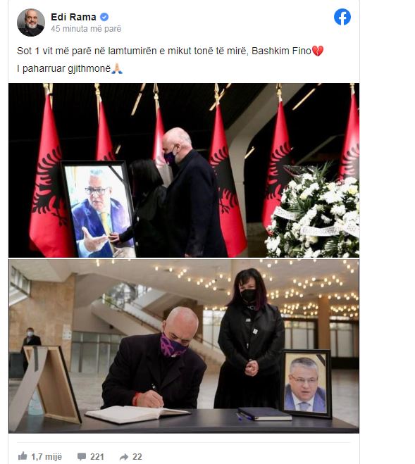 Rama shkruan në rrjete sociale se sot u bë një vit nga vdekja e një miku të mirë, siç e quan ai Finon.