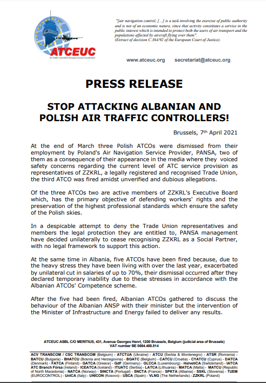 ATCEUC nxit PANSA dhe Albcontrol të rivendosin menjëherë ATCO-të që ata pushuan dhe fton si Qeverinë dhe Autoritetet Kombëtare Polake dhe atë Shqiptare për të vlerësuar plotësisht praktikat e Dialogut Social të ekipit aktual të Menaxhimit të ANSP. Do të ishte e mençur të mos nënvlerësohej solidariteti midis Kontrolluesve Evropian të Trafikut Ajror kur dëshmojmë një manifestim kaq të qartë të abuzimit të pushtetit me të cilin po përballen kolegët tanë nga Polonia dhe Shqipëria!”, thuhet në reagim e ATCEUC.