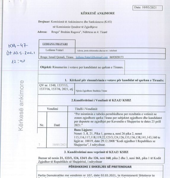 Kandidatja e PD në qarkun e Tiranës, Lediana Fratari, ka dorëzuar një kërkesë në Komisionin e Ankimimeve dhe Sanksioneve, lidhur me parregullsitë e caktuara në rocesin e nuëmrimit të votave për kandidatët e partive politike.