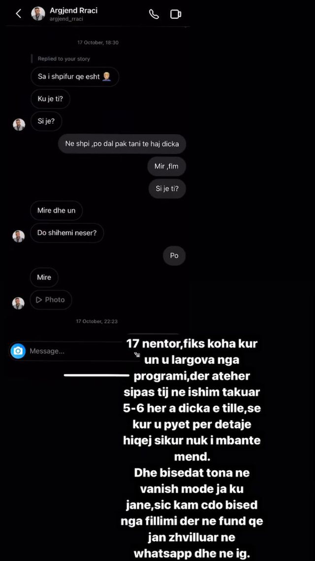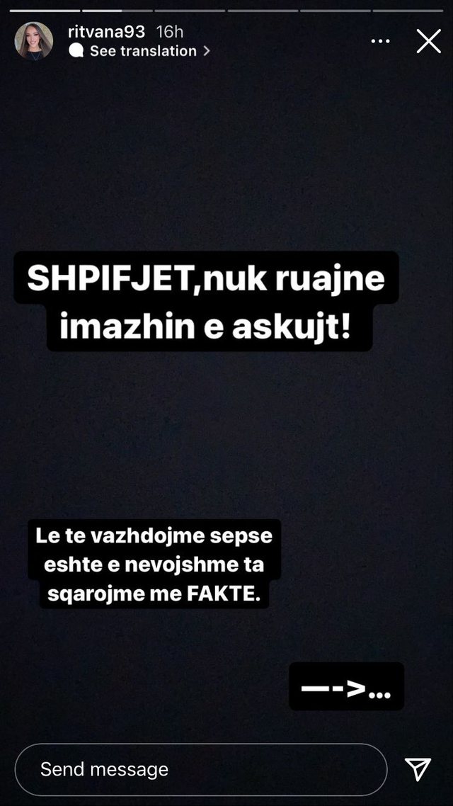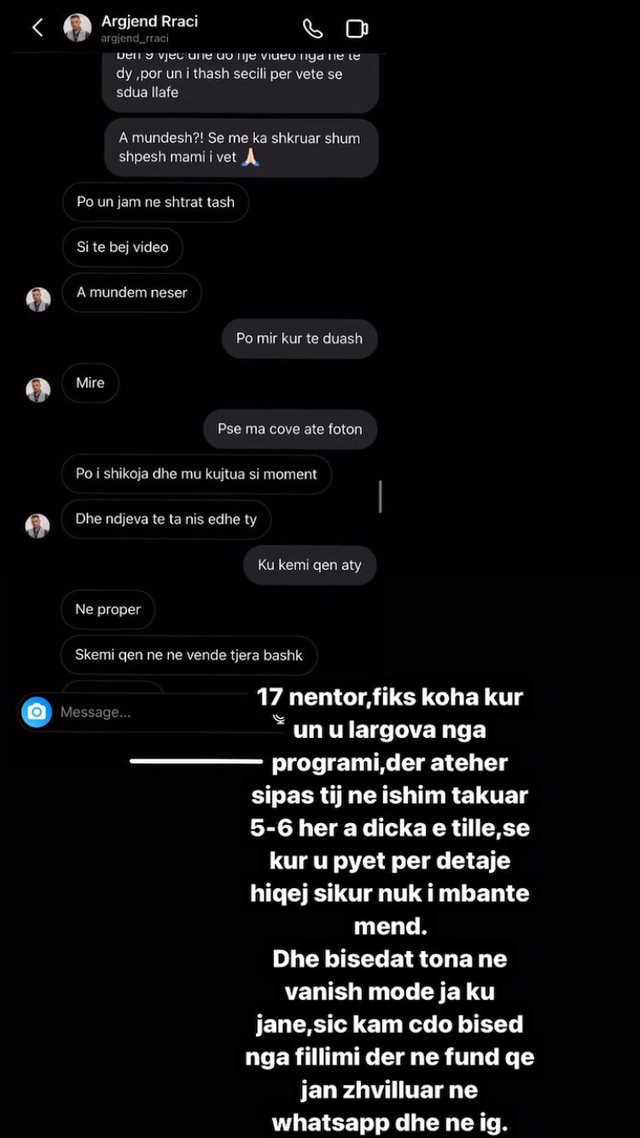 Qysh pas kthimit tim në program, unë s’kam dashur as të të shoh me sy sepse je treguar legeni më i madh në histori në atë bisedë që ne kemi pas (dhe prapë kam dëshmitar se ka qenë me zë të lartë telefonata) sesa doja të kisha t’bëja me ty duket nga takimi ynë i fundit, mendo të të vija në shtëpi ty kur s’doja as të të shihja me sy, mundësisht ka dëshmitar që as mirëmëngjes s’të kam thënë më kurrë se mëngjesi s’është kurrë i mirë me njerëz që mashtrojnë për të hequr fokusin nga e vërteta”, shkruan Ritvana.TCH