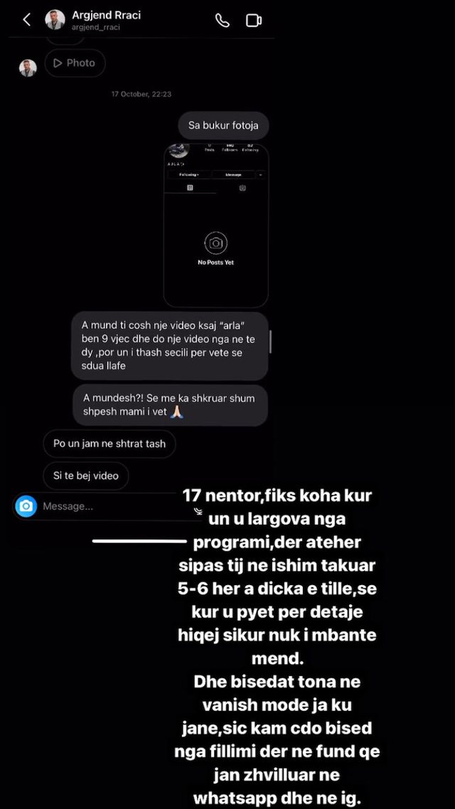 Këtë gjë, Ritvana e mohoi duke u betuar, por Argjendi ka vazhduar duke mbrojtur deklaratën e tij. Ditën e djeshme,Ritvana nuk ka duruar më dhe ka publikuar në Instagram bisedat me Argjendin.
