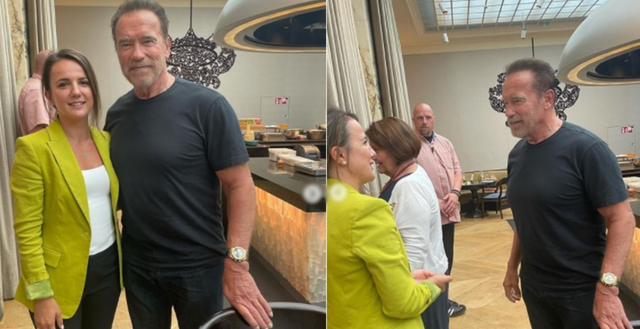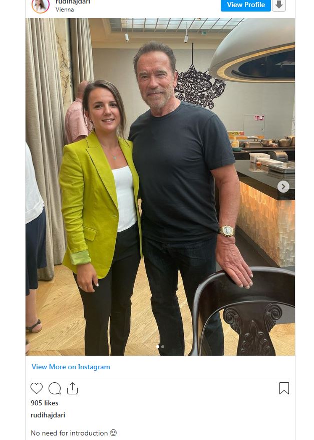 Hajdari ka takuar edhe aktorin e njohur austro-amerikan Arnold Schwarzenegger në këtë event . Deputetja ka postuar në llogarinë e saj në Instagram dy foto me aktorin ndërsa shkruan se ai “nuk ka nevojë për prezantim.”
