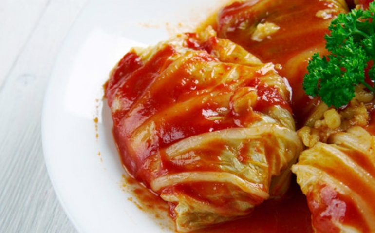 Sarmat radhiten në një enë të thellë dhe u qiten salca e domateve.