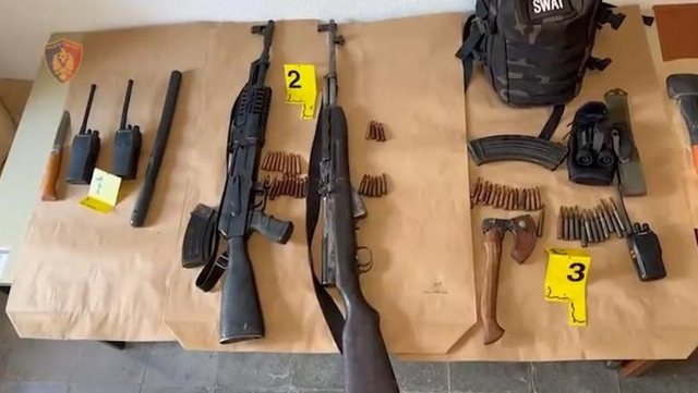 Sekuestrohen 2 armë zjarri, 1 silenciator, 6 radio si të Policisë, 4 mjete prerëse (thika), 2 sëpata, 5 dylbi, 1 xhup multifunksional dhe municion luftarak.