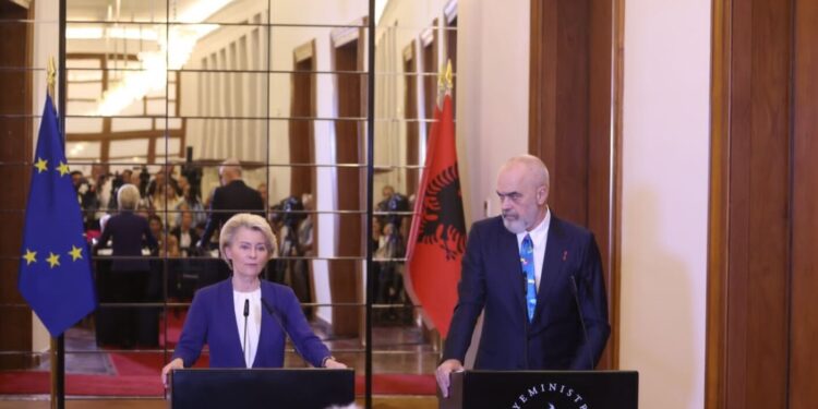 Gjatë konferencës së përbashkët për mediat, kryeministri shqiptar, Edi Rama tha se presidentja e KE-së “ka ardhur në Tiranë për të paraqitur një plan të ri që do ta ndihmojë shumë Ballkanin Perëndimor dhe vendin tonë që të ecin më shpejt drejt BE-së”.