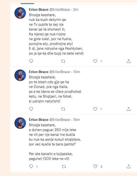 “Shoqja kazetare, nuk ka kush detyrim që në Tv publik te bej një kanal që ta shohësh ti; Ka njerëz qe nuk rrojnë ne gote luksi, por ne fusha, punojnë aty, prodhojnë aty! E di, janë ndryshe nga Pështyhen, po ja qe ka dhe bujq ne kete vend! Shoqja kazetare, po te blesh çdo gjë që ha ne Conad, pra nga Italia, as e ke idenë se çfarë prodhohet këtu, në Shqipëri, ne fshat, si ushqim natyrisht! Shoqja kazetare, a duhen paguar 250 mije leke ne vit për një kanal me kukulla ku nuk ka asnjë kukull shqiptare, por veç kukulla te bëra jashtë? Për atë kanalin e bujqësisë, paguhet 1200 leke ne vit”- shkruan Braçe.