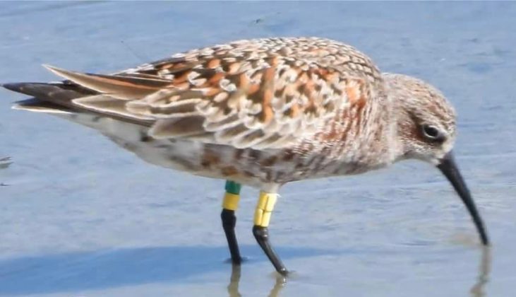 Ky shpend është individ i gjelëzës gushëkuqe (Calidris ferruginea) që është unazuar në mars të vitit 2018 në arkipelagun Bijagos në Gine-Bisonë e largët në Afrikën Perëndimore.