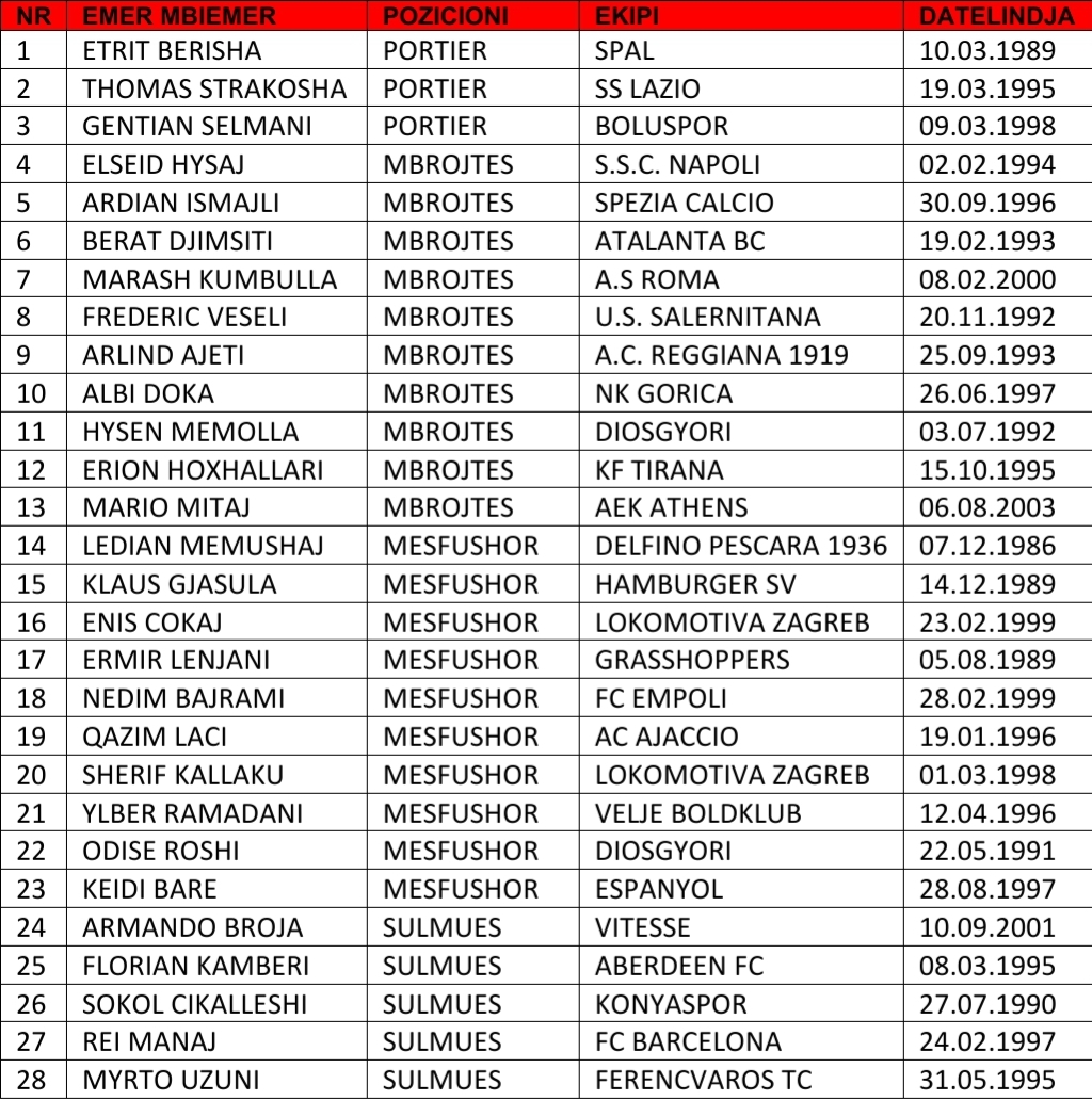 Trajneri i Kombëtares shqiptare të futbollit, Edoardo Reja, ka shpallur listën me 28 lojtarë që janë ftuar për tre ndeshjet e vlefshme për eliminatoret e Botërorit Katar “2022”.