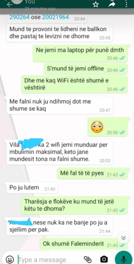 Në një bisedë të publikuar në rrjete sociale, klientët kërkojnë më shumë internet për të punuar nga dhoma, por ajo që bie në sy është fakti që gjithë kohës, pronarët përgjigjen me mirësjellje. Madje dhe duke përdorur “fjalët magjike”.