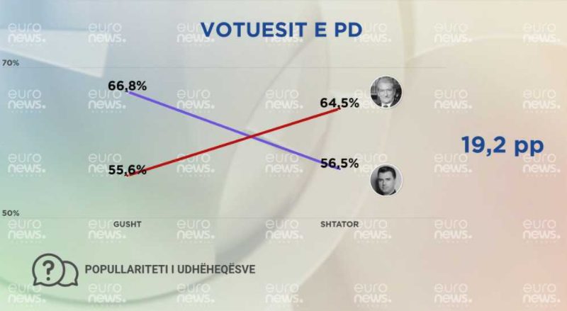 Votuesit e Partisë Demokratike preferojnë më shumë Sali Berishën sesa Lulzim Bashën. Në anketimin e muajit shtator, Euronews Albania pyeti shqiptarët se cilin prej dy udhëheqësve pëlqejnë më shumë. 65% e votuesve të PD pëlqejnë sot më shumë Berishën, ndërsa 57% preferojnë Lulzim Bashën.