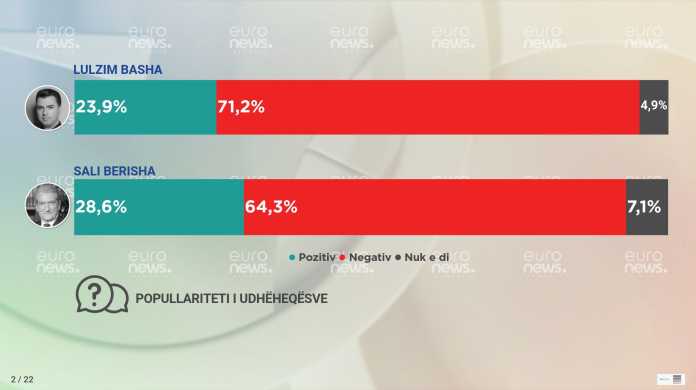 Anketa e muajit Shtator tregon rritje të mbështetjes në popullsi për Sali Berishën, nga 19% në 29%. Ndërkohë për Lulzim Bashën mbështetja mbetet thuajse e njëjtë, nga 26% në 24% të shqiptarëve./Euronews Albania