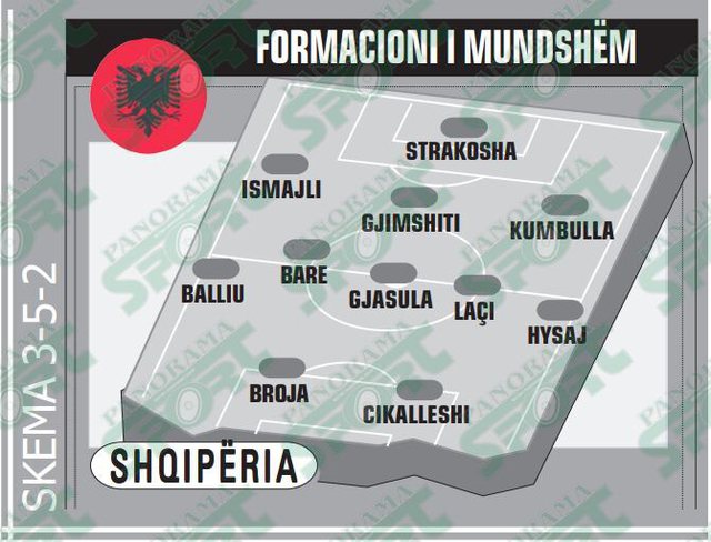 Në mbrojtjen me tre do të rreshtohen Ismajli, Gjimshiti dhe Kumbulla, ndërsa nga krahët do të jenë Balliu në të djathtë dhe Hysaj në të majtë. Në mesfushë gjasat më të mëdha janë të luajnë Bare, Gjasula dhe Laçi.