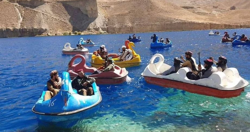 Pamjet e publikuara tregojnë militantët që kanë hipur në barkat në formë mjellmash dhe pedalojnë në ujin e Parkut Kombëtar Band -e Amir. Më parë kjo ishte një pikë e vizituar turistike për të huaj e vendas. Parku ka gjashtë liqenë të thellë që ndodhen në malet Hindu Kush, afërsisht 45 milje nga Bamiyan, dikur shtëpia e Budave të Bamiyanit, të cilat talebanët i shkatërruan në 2001.