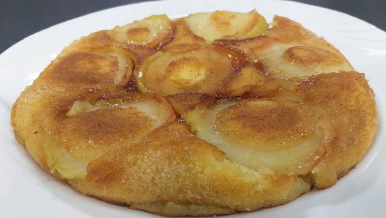 Përgatitja: Lyejmë mirë ( pak trashë) një tigan me gjalp e spërkasim atë me sheqer në të gjithë sipërfaqen. Lajmë mirë një mollë dhe presim atë në rrathë me trashësi 0.4-0.5 cm me ndihmën e një kapaku shishe ose instrumenti të posaçëm pastrojmë qendrën nga farat.Vendosim fetat e mollëve në tigan duke mbuluar komplet sipërfaqen e tiganit dhe i spërkasim me kanellë. Në një tas vendosim një vezë të plotë, pak kripë, sheqer vanilje, 3 lugë gjelle sheqer i rrahim mirë me tel vezën deri sa sheqeri të shkrijë dhe 1 filxhan kafe vaj bimor, vazhdojmë përzjerjen deri sa të na formohet një masë kremoze dhe 1 gotë qumesht përziejmë përsëri miellin pak nga pak dhe duke e përzjerë vazhdimisht shtojmë pluhurin pjekës , e përziejmë në fund dhe shtojm 1 lugë gjelle uthull dhe pasi të kemi përzjerë mirë të gjithë përbërësit e shtojmë brumin mbi fetat e mollëvë. Vendosim tiganin,e zierë në temperaturë nën mesatare të mbuluar me kapak për 15- 29 minuta. E shohim nëse shkëputet nga tigani dhe në ndihmën e një pjate e kthejmë dhe e pjekim dhe në anën tjetër për 10 minuta përsëri të mbuluar me kapak. E shërbejmë pasi të jetë ftohur.