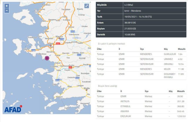 Dy tërmete goditën qytezën Menderes të Izmirit gjatë mesditës së sotme duke shkaktuar p anik te banorët. Mediat lokale raportojnë se tërmeti i parë ishte me magnitudë 4.2 të shkallës Rihter i ndjekur disa minuta më pas nga një tjetër me magnitudë 4.3 të shkallës Rihter.
