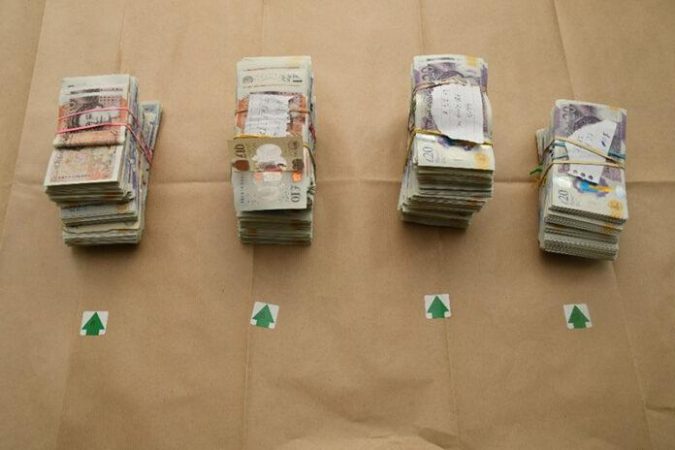 Kolektivisht një total prej 60,000 £ u gjetën gjithashtu në pako, ndërsa, veçmas, njëri nga katër burrat e pranishëm kishte 400 £ dhe tjetri 300 £.