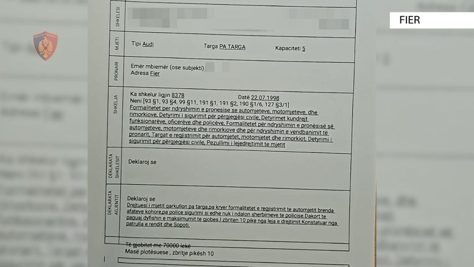 Fier, U largua gjatë kontrollit të dokumentacionit të automjetit, ndëshkohet me masë administrative 70 000 lekë dhe procedohet penalisht për mosbindje ndaj urdhrit të Policisë, 28-vjeçari.