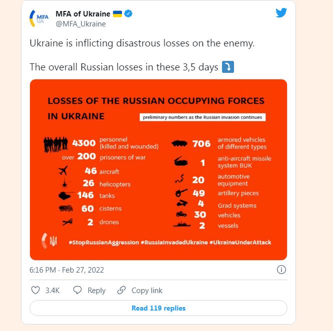 Ministria ukrainase e Punëve të Jashtme e ka publikuar një grafikë me të gjitha të dhënat e humbjeve të përgjithshme të forcave ruse për tri ditë e gjysmë luftime.