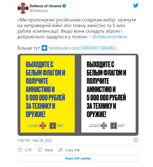 Ministri i Mbrojtjes së Ukrainës, Oleksi Reznikov ka publikuar ofertën e Ukrainës drejtua ushtarëve rusë të cilët janë futur brenda territorit të shtetit ukrainas.