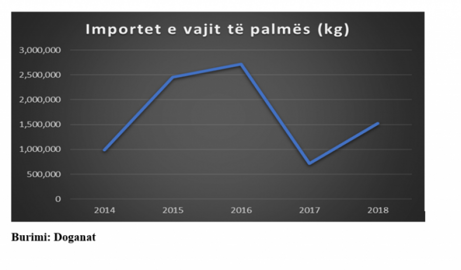 Pas një rënie të importeve të vajit të palmës në tregun shqiptar për vitin 2017, kur u regjistruan vetëm 712 mijë kilogramë, në vitin 2018 trendi ka ndryshuar sërish.Të dhënat zyrtare të doganave tregojnë se grupi i vajit të palmës dhe fraksioneve të tij është dyfishuar duke prekur nivelin 1.5 milionë kilogramë. Po kështu sipas këtyre shifrave në pesë vitet e fundit nivelin më të lartë të importeve për vajin e palmës e mban viti 2016 me 2.7 milionë kilogramë kurse viti 2015 kishte një import në nivelet 2.4 milionë kilogramë.