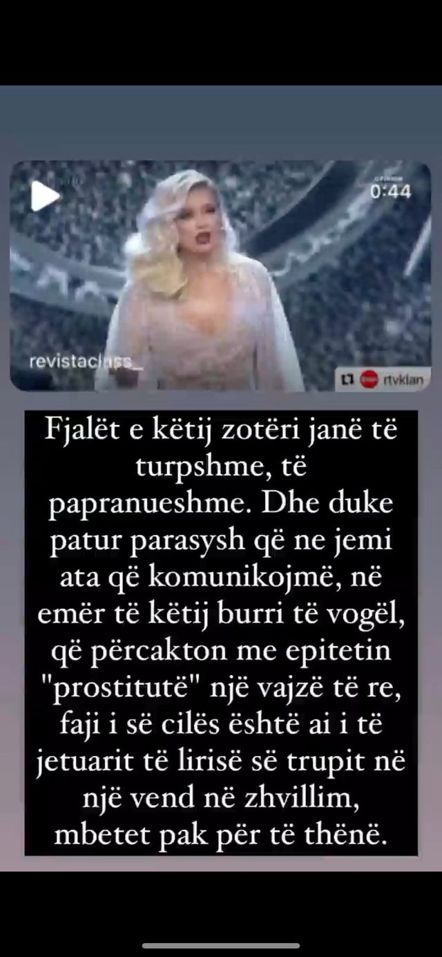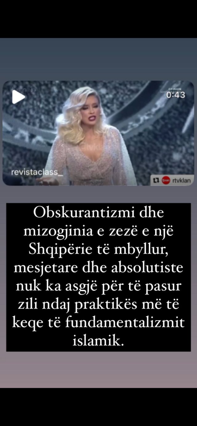 Likmeta në storyn e saj në Instagram, nisur dhe nga lajmet e prodhuara në media për këtë incident, shkruan se “obskurantizmi dhe mizogjinia e zezë e një Shqipërie të mbyllur mesjetare dhe absolutist nuk ka asgjë për të pasur zili ndaj praktikës më të keqe të fondamentalizmit islamik.