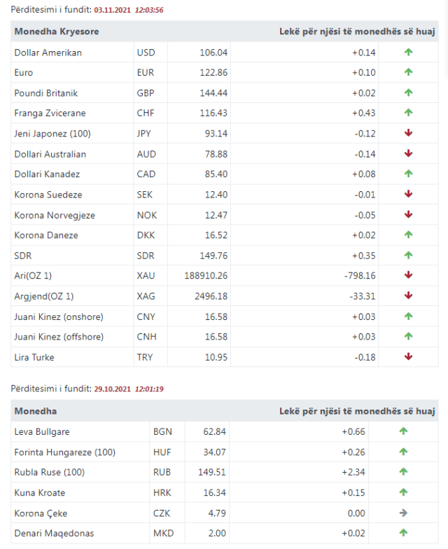 Sipas kursit zyrtar të Bankës së Shqipërisë, monedha e gjelbër amerikane u forcua me 0,14 lekë dhe këmbehet me 106,08 lekë, ndërsa euroja fitoi terren me 0,10 lekë dhe këmbehet me 122,86 lekë.