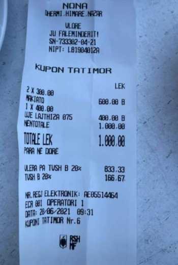Fatura që shihni më poshtë është lëshuar para dy ditësh në një kafe në Dhërmi dhe ilustrohet më së miri situata alarmante e çmimeve. Epo, përveç temperaturave përvëluese që janë prezente këto ditë, mesa duket kjo verë paska për të qenë “përvëluese” edhe për xhepin e qytetarëve kur mungojne tatimoret.NEWSBOMB