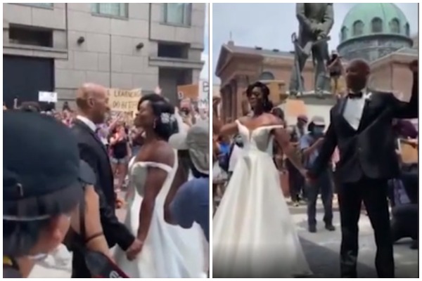 Ata e ‘zhvendosën’ ceremoninë më pas në një park të vogël, ndërsa mijëra njerëz kalonin në rrugë me pankarta në duar. “Ishte një zgjedhje që ne e kishim menduar mirë dhe që e donim me forcë. Të gjithë shohim padrejtësi dhe racizëm dhe për këtë arsye e ndjemë të ishim pjesë e protestës dhe e konsiderojmë këtë një moment të paharrueshëm”, thanë të sapomartuarit.