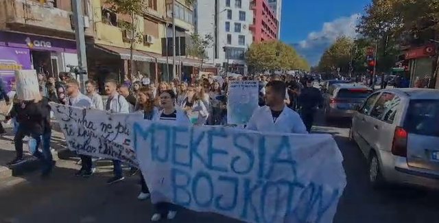 Këto janë pjesë e studentëve të Fakultetit të Mjekësisë së tyre kanë vijuar edhe sot protestën e tyre, e cila është në javën e tretë. Ata kanë bojkotuar mësimin dhe kanë nisur protestën kundër kontratës për punë të detyruar në Shqipëri në përfundim të studimeve.
