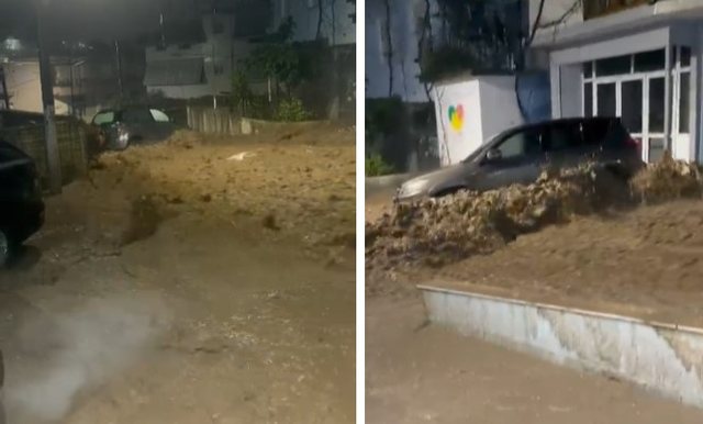Në videon që po qarkullon në rrjet, shihet momenti kur rrjedha e fuqishme e ujit merr përpara disa automjete, të cilat lëvizin të pakontrolluara në mes të rrugës.