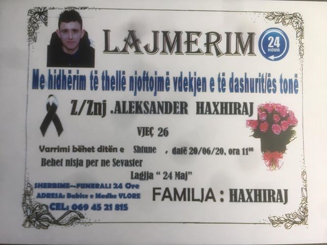 Lajmërimi i cermonisë mortore të djaloshit Aleksandër i cili humbi jetën mbrëmjen e djeshme si pasojë e një thike në zemër. Vlora News i shpreh ngushëllimet tona familjes së të ndjerit! Qofsh i parajsës!