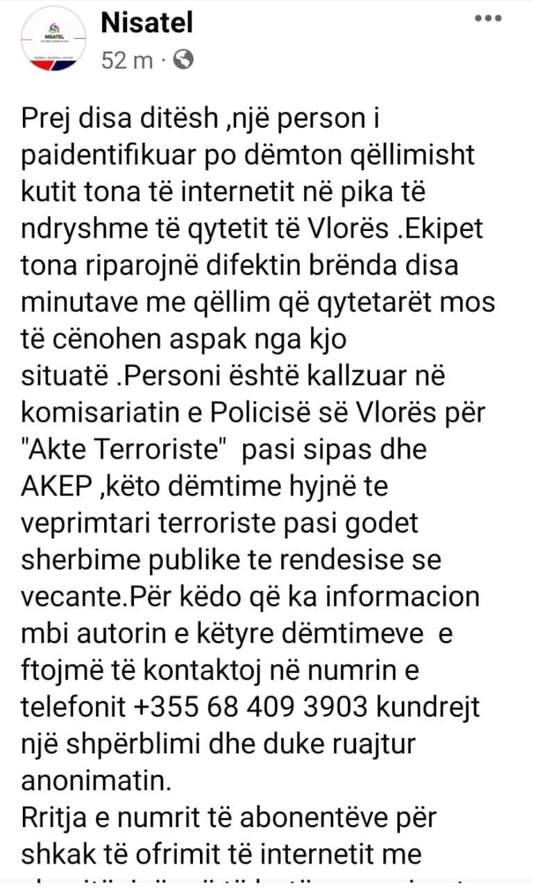 Prej disa ditësh, një person i paidentifikuar po dëmton qëllimisht kutit tona të internetit në pika të ndryshme të qytetit. Ekipet tona riparojnë difektin brenda disa minutave me qëllim që qytetarët mos të cënohen aspak nga kjo situatë. Personi është kallëzuar në komisariatin e Policisë së Vlorës për “Akte Terroriste” pasi sipas dhe AKEP, këto dëmtime hyjnë tek veprimtaritë terroriste pasi godet sherbime publike të rëndësisë së vecantë.