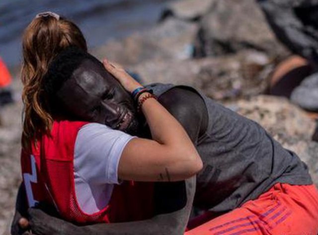 Një foto e shkrepur nga të pranishmit, kanë treguar shpirtin humanitar të vullnetares së Kryqit të Kuq, që po kujdesen për emigrantët që janë nisur nga Afrika në Spanjë. Mes lotësh, vullnetarja ka përqafuar emigrantin i cili ishte dehidratuar.