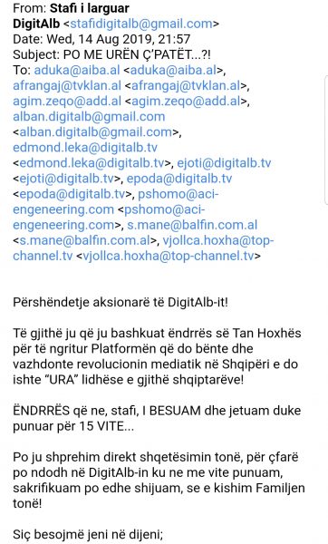 Stafi i Digitalb, gati 80 drejtues në vite të kompanisë nëpëmjet një emaili në mbrëmjen e 14 Gushtit, i janë drejtuar aksionarëve të kompanisë, pas largimeve masive të filluara kohët e fundit nga Vjollca Hoxha, cna.al ka siguruar emalin e plotë.