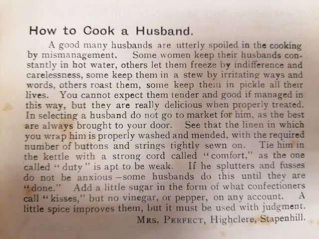 Një libër 110-vjeçar recetash, ku përfshihet edhe receta perfekte “se si të gatuash burrin”, është gjetur në një shtëpi të vjetër, që kishte dhjetëra vite e pabanuar. Në njërën prej recetave, ku tregohet mënyra perfekte për të “gatuar burrin”, shkruhet: