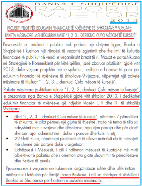 Sipas regjistrit të shpenzimeve dhe Raportit Vjetor-2013, të Bankës së Shtetit, në datën 27 maj 2013 (10 ditë para mbylljes së shkollës), Guvernatori Ardian Fullani, ka sajuar dhe financiuar “Projektin pilot: “Edukimi bankar i nxënësve 7-14 vjeçar”, me literaturë metodike mësimore, 1 libër me 7 përrallëza.