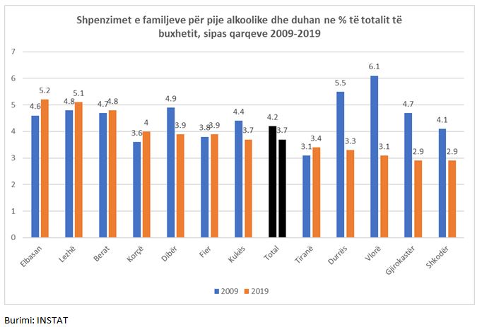Shpenzimet për pije alkoolike dhe duhan të familjeve shqiptare kanë ardhur në rënie të lehtë gjatë dekadës së fundit, por në disa qarqe janë rritur më tej dhe për disa të tjera ka rënie të ndjeshme. Sipas të dhënave të INSTAT nga anketa e buxhetit të familjeve në vitin 2019 qarqet e Elbasanit, Lezhës dhe Beratit kishin shpenzimet më të larta për alkool dhe duhan në raport me buxhetin total përkatës. Familjet në Elbasan shpenzuan mesatarisht 5.2 për qind të buxhetit të tyre me cigare dhe pije, duke u rritur me 0.6 pikë përqindje në raport me vitin 2009.