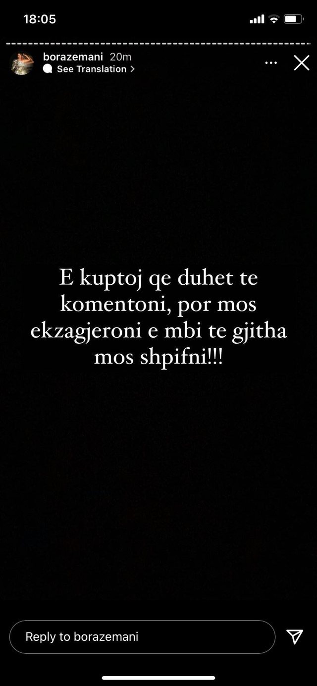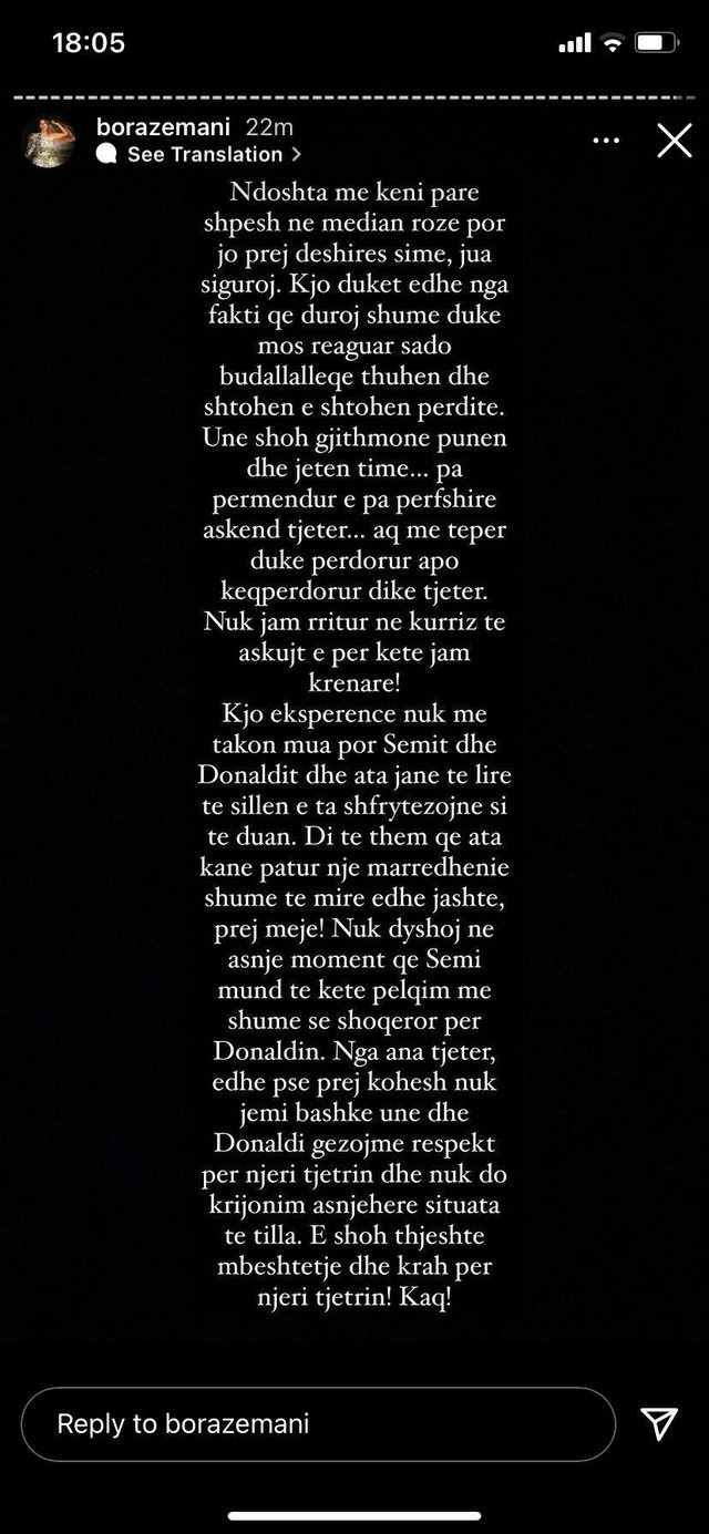 Bora Zemani ka vendosur të reagojë për lajmet dhe komentet që prej 3 javësh po bëhen për afrimitetin e Semit dhe Donaldit në Big Brother VIP. Përmes 3 storieve në Instagram, ajo shpërthen kundrejt emrit që i kanë përmendur. Ajo tha se ata dy kanë shoqëri shumë të mirë jashtë dhe se ajo që kanë ata dy, është miqësi dhe asgjë më shumë. Moderatorja tha se me Donaldin është ndarë prej kohësh por që gëzojnë respekt të madh për njëri-tjetrin.