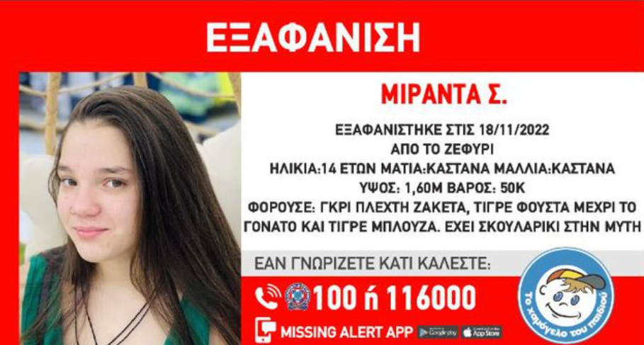 Një 14-vjeçare e identifikuar si Miranda S., 14 vjeçe, është zhdukur nga zona e Zephyrios, Atikë, Greqi. Lajmi është bërë me dije nga mediet e vendit fqinj, të cilat shkruajnë se e mitura shqiptare është zhdukur prej datës 18 nëntor.