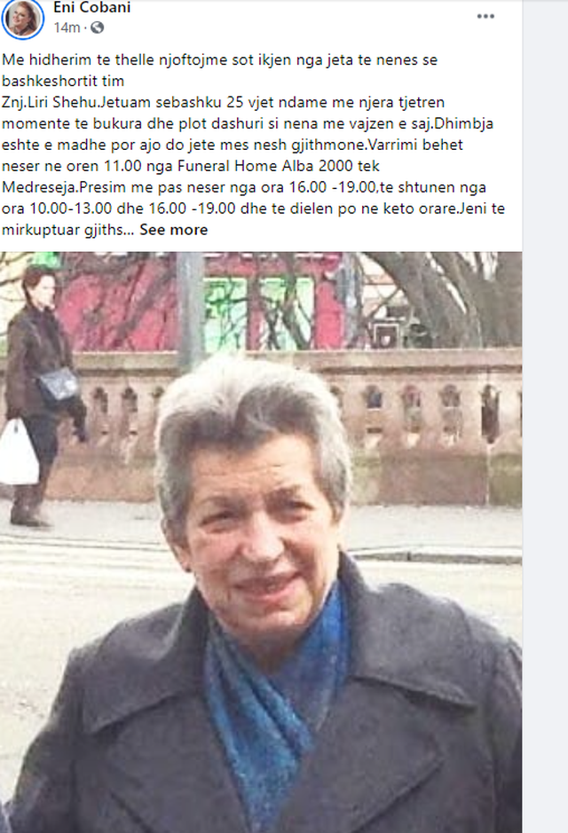 Znj.Liri Shehu.Jetuam sebashku 25 vjet ndame me njera tjetren momente te bukura dhe plot dashuri si nena me vajzen e saj.Dh imbja eshte e madhe por ajo do jete mes nesh gjithmone.Va rrimi behet neser ne oren 11.00 nga Funeral Home Alba 2000 tek Medreseja. Presim me pas neser nga ora 16.00 -19.00,te shtunen nga ora 10.00-13.00 dhe 16.00 -19.00 dhe te dielen po ne keto orare.Jeni te mirkuptuar gjithsecili per kohen e veshtire qe po kalojme te gjithe.Ju falenderojme nga zemra per ngushellimet dhe jau kthefshim ne te mira.Familja Shehu.”, njofton Eni Çobani.